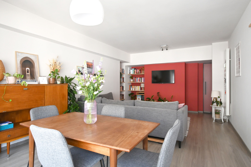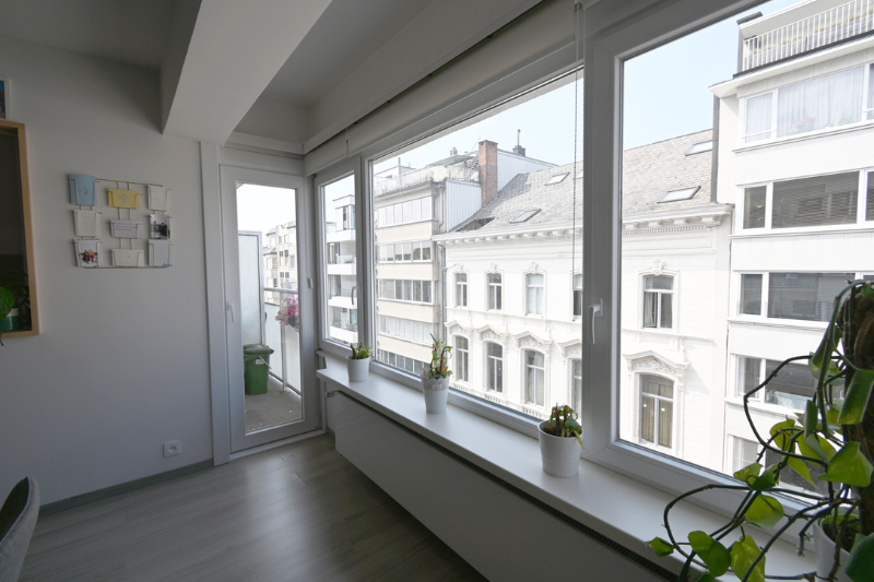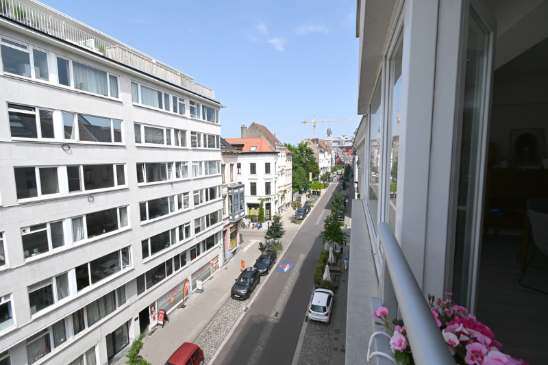 Het appartement (± 81m²) met hedendaagse, moderne afwerking bevindt zich op de vierde verdieping van een verzorgd gebouw. De leefruimte baadt in het licht dankzij de grote raampartijen en hoge plafonds. Het is er heerlijk vertoeven in de knusse zithoek met ingemaakte bibliotheek. De open keuken is volledig uitgerust en sluit aan op de eet- en zithoek. Er zijn twee lichtrijke slaapkamers en een moderne badkamer met douche en aansluiting voor was en droog. Samen met een apart ruim toilet geven deze kamers uit op de nachthal. Bovendien geniet je van een zuidgericht knus terrasje die aansluit op de master slaapkamer en waar het genieten is van bij het ontbijt tot bij de apéro of later... Een tweede kleiner terras/balkon aan de voorzijde van het gebouw is ideaal voor het wegbergen van vuilnisbakken, netjes uit het zicht.