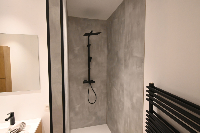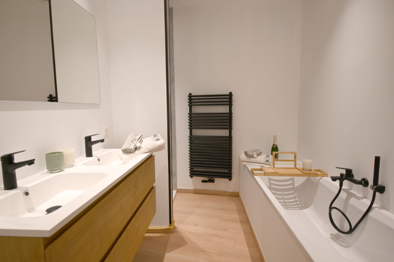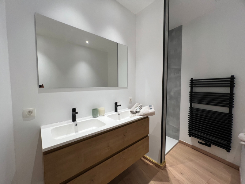 Je komt binnen in een praktische voorplaats die je meteen het gevoel van orde en rust geeft. Deze ruimte fungeert ook als technische ruimte met aansluiting voor was- en droogmachine, ideaal als vestiaire, wasruimte of zelfs een klein bureel. Voordeel: ze biedt geen rechtstreekse inkijk in de leefruimte! Aansluitend bevindt zich een open hal met toegang tot het gastentoilet en de badkamer. Verder kom je in een indrukwekkende leefruimte van 49 m², gerealiseerd in volledige nieuwbouw badend in het licht en met een prachtig zicht op de tuin en het groen daarachter. Hier kook je, leef je, ontvang je vrienden en geniet je van elk moment.